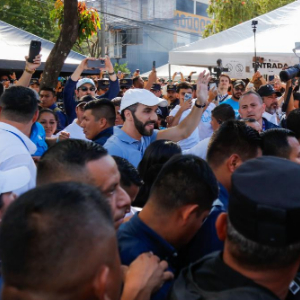 2月4日,在萨尔瓦多圣萨尔瓦多省,新思想党代表的竞选联盟候选人纳伊布·布克尔(中)向其支持者致意。新华社发(亚历山大·培尼亚摄)