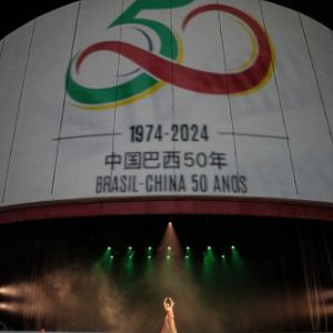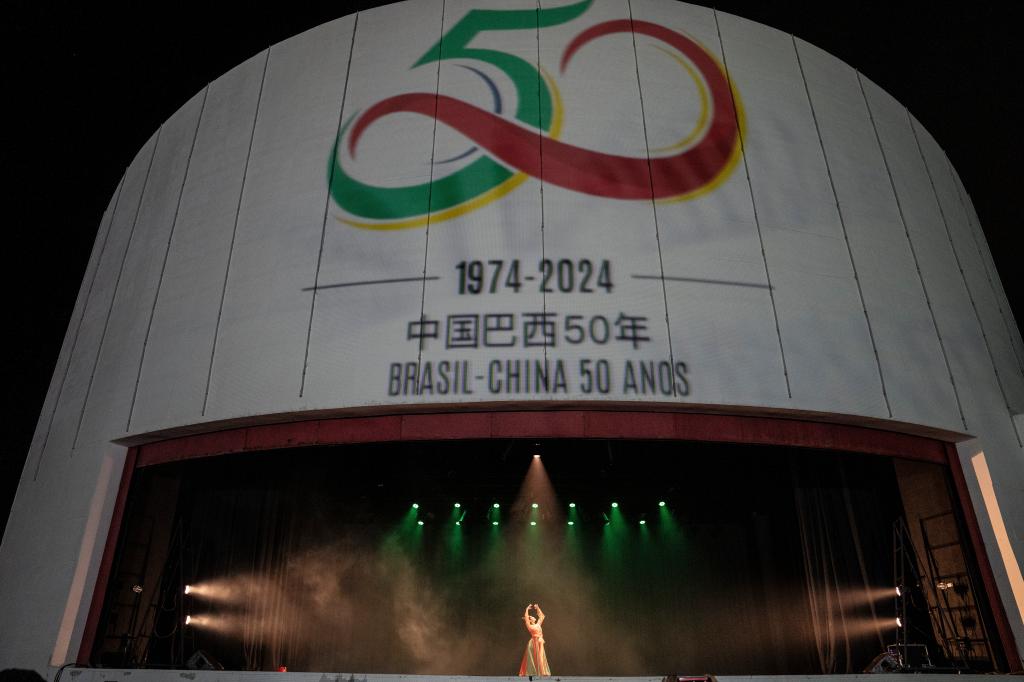 演出过后,五星红旗、巴西国旗依次亮起,中巴建交50周年的标识出现在观众们眼前。