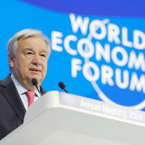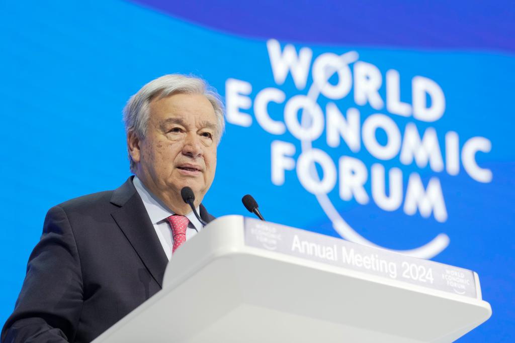 图为2024年1月17日,联合国秘书长古特雷斯在瑞士达沃斯举行的世界经济论坛2024年年会上致辞。新华社发(世界经济论坛供图)