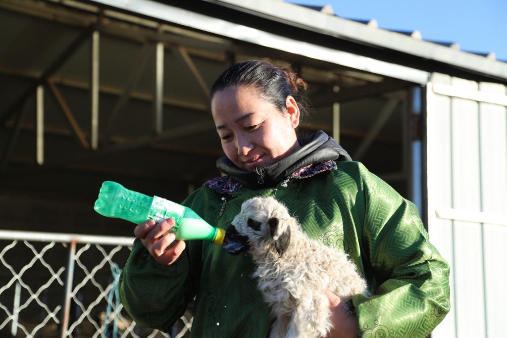 只见朝克抱起小羊羔细细查看,喜形于色。朝克的孩子们会在不上学的时候主动帮忙。早上六点多,两位小家伙就起床了,没吃早饭便跑去羊圈,见到新出生的小羊羔早已按捺不住内心的激动,他们有的学着爸爸抱起羊羔,有的学着妈妈给羊羔喂奶。看到这里,我不由得按下快门,记录下这一家人和羊羔的温馨画面。这是我在牧区拍的最有温度的一组照片,也是最自然、最真实的画面。