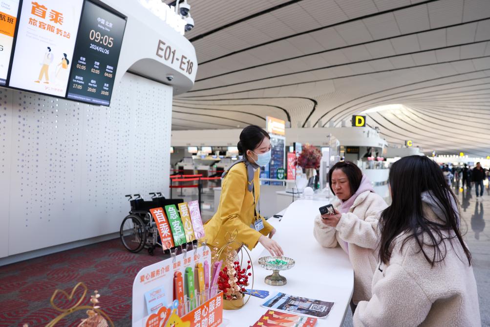 在北京大兴国际机场,工作人员为旅客提供咨询。新华社记者 鞠焕宗 摄