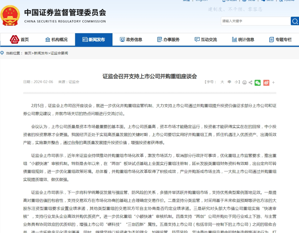 据了解,证监会上市司2月5日召开座谈会,就进一步优化并购重组监管机制、大力支持上市公司通过并购重组提升投资价值征求部分上市公司和证券公司意见建议,并就市场关切的热点问题进行交流讨论。(记者刘慧、刘羽佳)