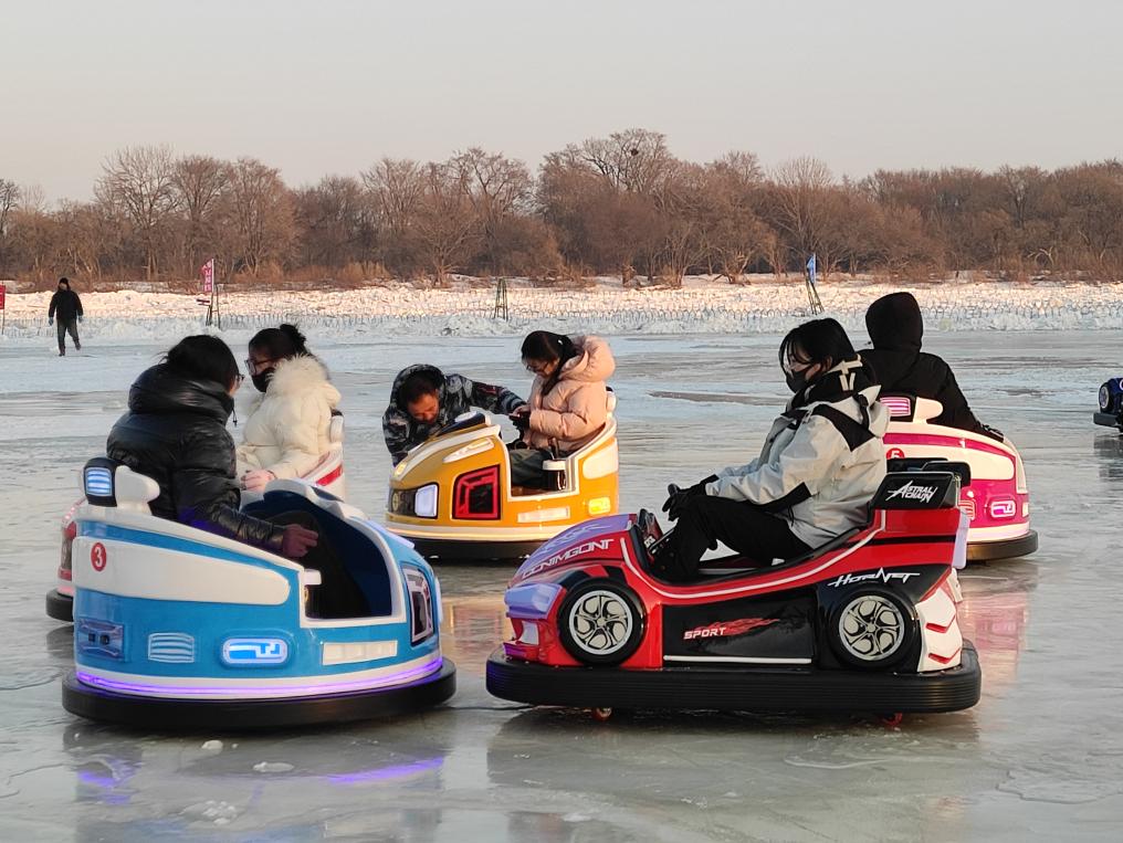 在位于虎林市虎头镇的虎头冰雪乐园内,越野车拉着雪圈扬起阵阵雪雾,不时传来游客的笑声,一旁的蓝色帐篷内,有游客享受着冰钓的乐趣。