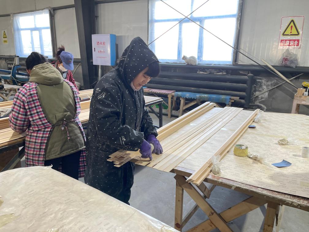 在王秀芹打工的密山市明泽经贸有限公司,生产车间内,有人在操作机械切割木头,有人将木条喷漆、装箱,一派繁忙景象。