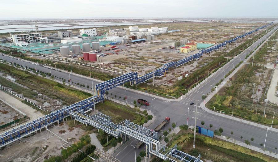 这是2023年10月19日拍摄的河北沧州渤海新区黄骅市临港经济技术开发区工业管廊(无人机照片)。新华社记者 骆学峰 摄