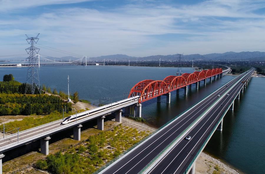 一列动车组列车从河北省怀来县境内的京张高铁跨官厅水库特大桥上通过(2022年9月25日摄,无人机照片)。新华社记者 杨世尧 摄