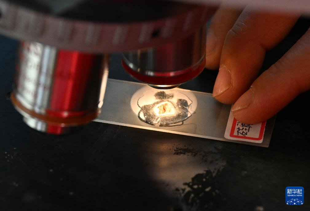 2月3日,在深地塔科1井,科研人员在用显微镜研究地底深处取上来的岩屑。新华社记者 李响 摄