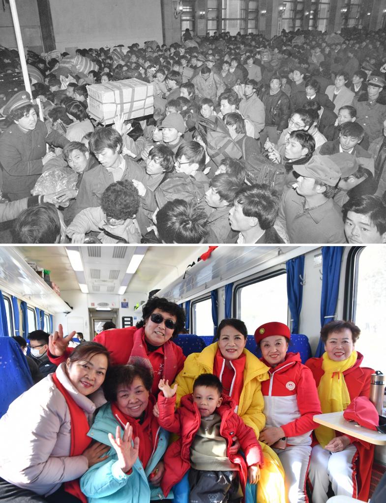 拼版照片:上图为1993年1月12日,北京火车站开始进入春运高峰,旅客在排队进站(新华社记者唐召明摄);下图为2020年1月10日,旅客在南京南站内布置的“幸福小康照相馆”拍照留念(新华社记者季春鹏摄)。