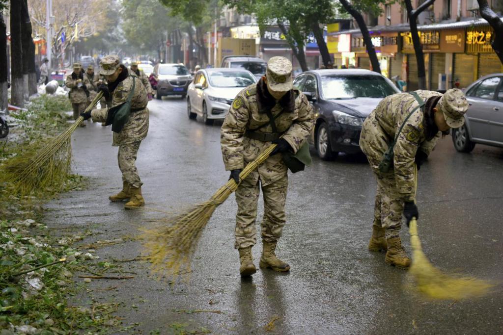 2月4日,武警湖南总队岳阳支队官兵在岳阳市巴陵东路段清雪除冰。朱政镒 摄
