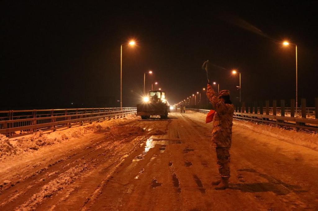 2月5日晚19时50分,沪蓉高速荆门市京山段黄湾大桥路面积雪结冰,交通严重拥堵,数百名返乡人员滞留高速长达10多个小时。武警湖北总队荆门支队官兵出动破障车、起重车等装备,携带铁锹、雪铲、洋镐等工具铲雪除冰。官兵们还分成多个小组,徒步搬运物资,在拥堵路段逐车询问受困群众身体状况、困难情况,将自热米饭、饼干、饮用水等送到群众手中。