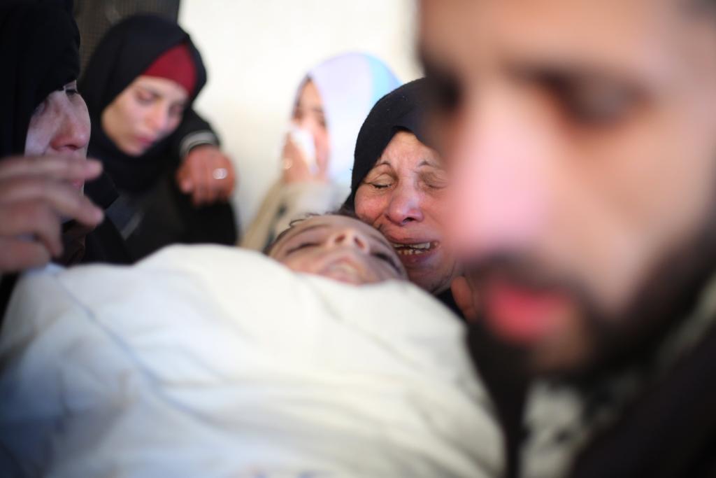 2月3日,在加沙地带南部城市拉法,巴勒斯坦人悼念死者。新华社发(哈立德·奥马尔摄)