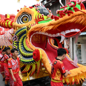 2月1日,由马来西亚和中国的100多名青少年组成的舞龙队在马来西亚马六甲市鸡场街上共舞一条近200米的“长龙”。