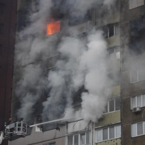 2月7日,消防员在乌克兰基辅为被导弹碎片击中的居民楼灭火。新华社发(罗曼·佩图什科夫摄)