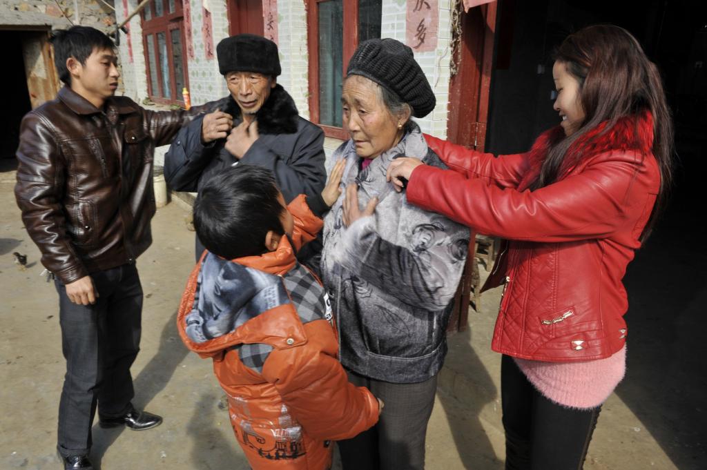 2013年春运期间,贵州黔西南州安龙县平乐乡朗元村外出打工的陈顺付回到家中,这是1月29日陈顺付和妻子一起帮老人试穿新装。新华社记者 欧东衢 摄