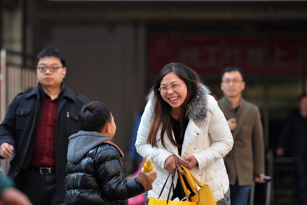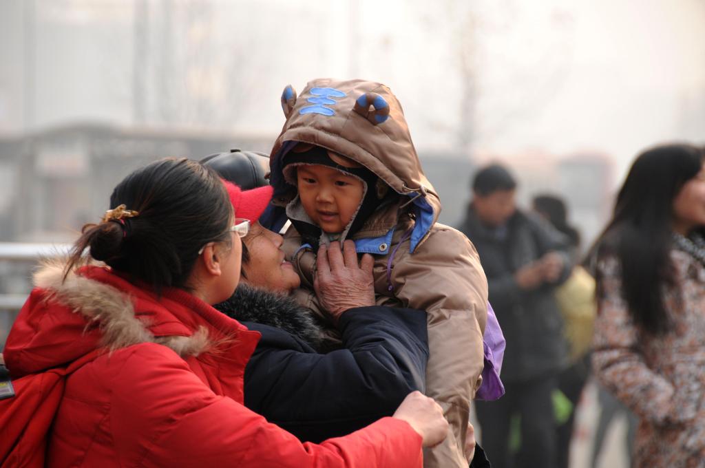 2015年2月18日,在兰州火车站,一名到达旅客见到孩子后露出笑容。新华社记者 陈斌 摄