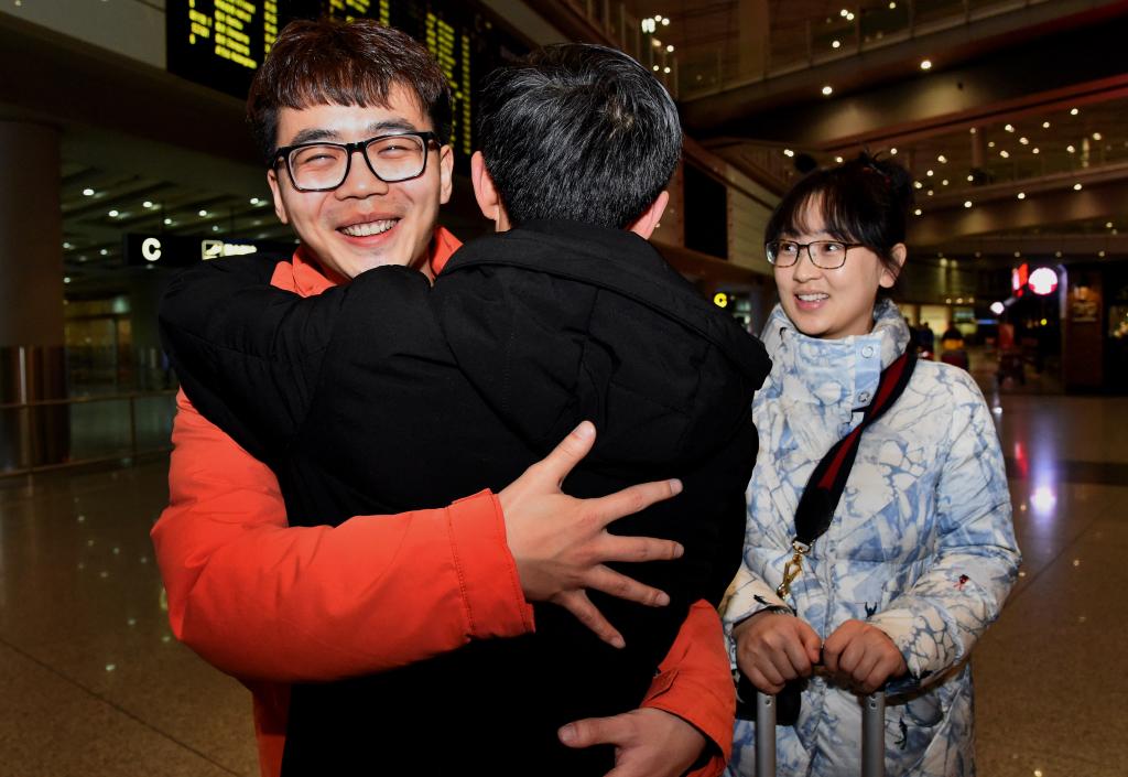 2019年1月30日,孙立(左)与父亲在首都机场拥抱。孙立夫妻两人在北京工作繁忙,同时孩子年龄较小,需要家里人的照顾,孙立邀请远在老家贵州省遵义市的父亲来到北京过年。 新华社记者 任超 摄