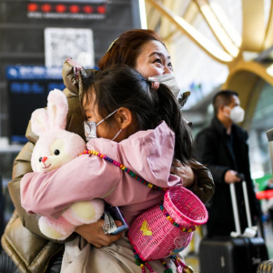 2023年1月15日,曹紫嫣小朋友抱着兔子玩偶在昆明市长水机场迎接妈妈。新华社记者 江文耀 摄
