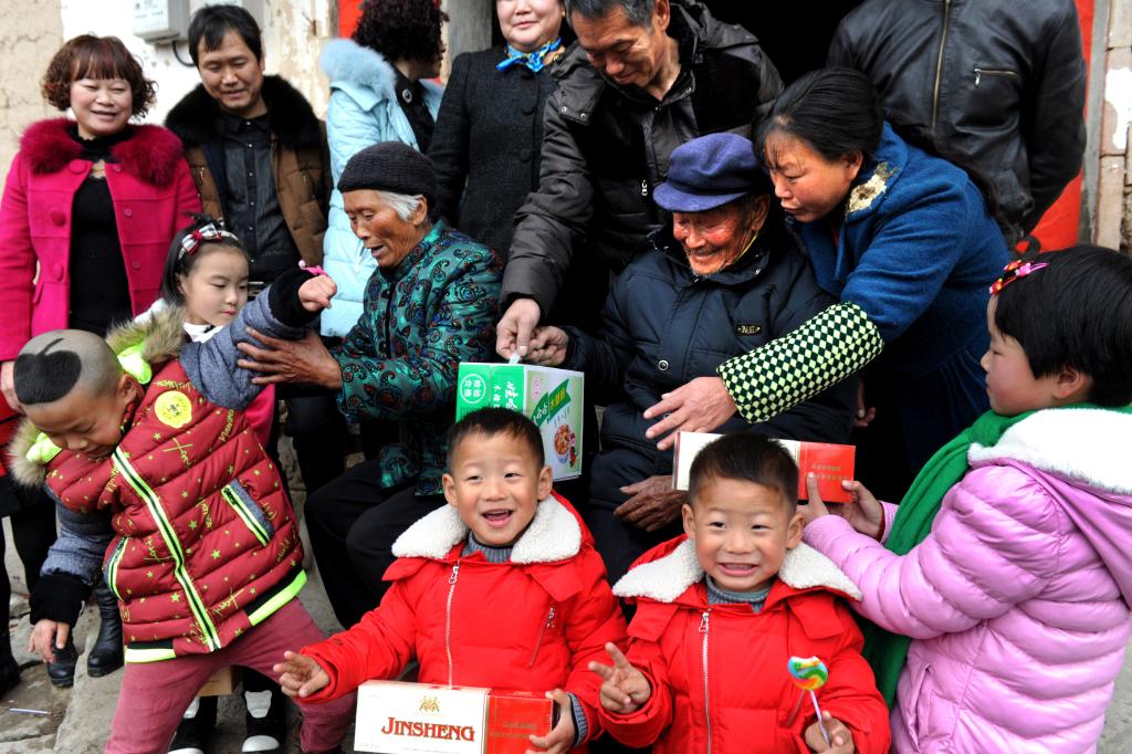 2015年2月17日,晚辈们回家团聚让浙江省武义县新宅镇安凤村朱功其(二排右二)和戴金球(二排右三)老夫妻倍感温馨。新华社发(张建成 摄)