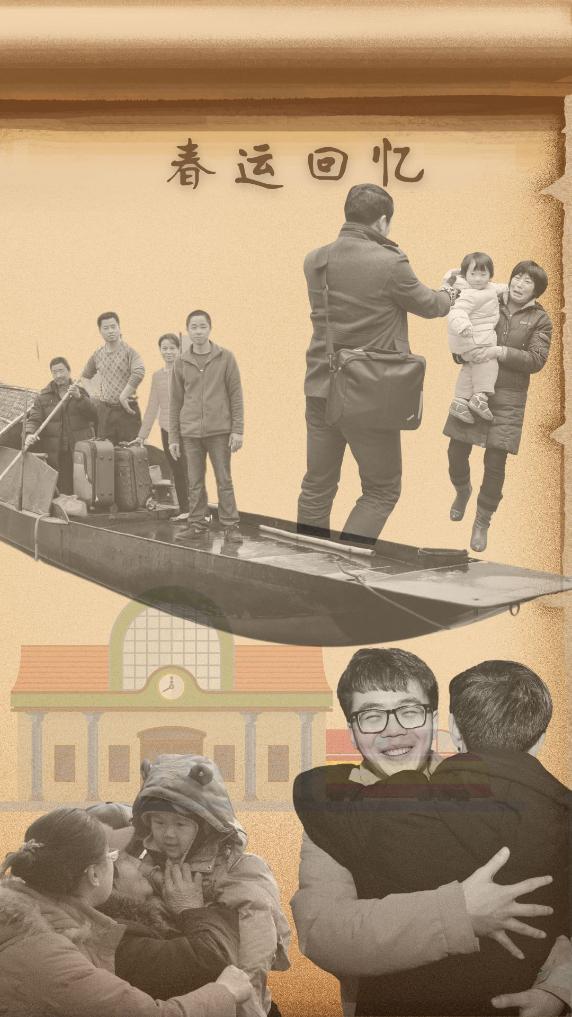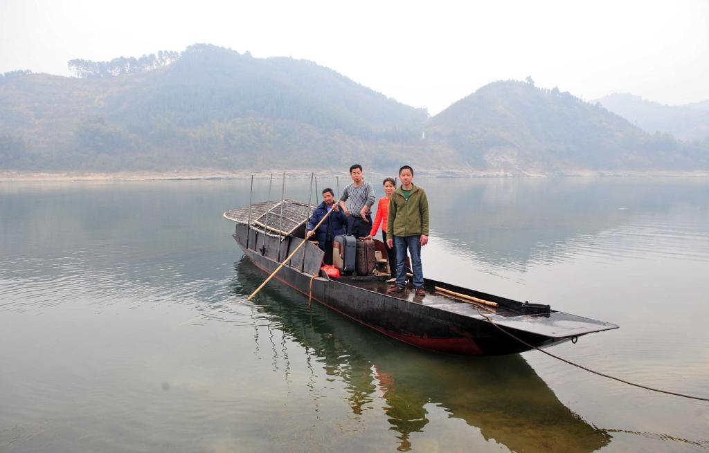 2014年1月28日,李家仁(右一)、李家才(左二)及妻子回到镇上后,父亲用船接他们回家(拼版照片,1月28日摄)。家住在广西柳江里雍乡长沙村的李家仁和李家才兄弟在广东打工。春节前,他们乘坐大巴到柳州,然后换乘中巴车到柳江县里雍乡,最后再坐船渡江回到家里。行程700多公里,需8个小时。新华社记者 黄孝邦 摄