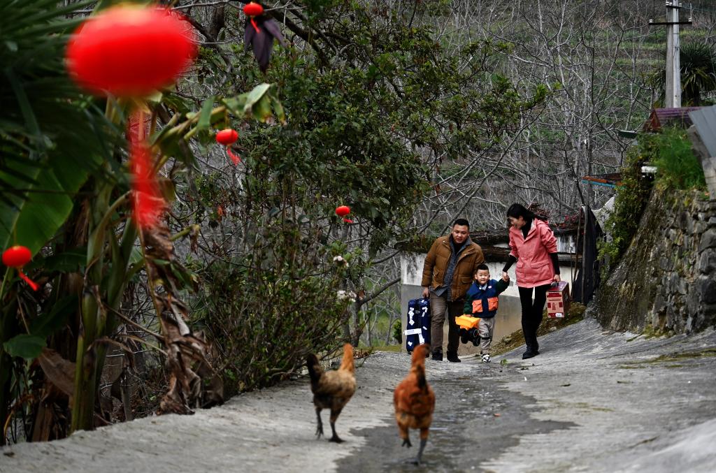 2024年2月6日,在北京开餐厅的张红径回到家乡云南大理南涧县沙乐村,他的妻儿到村口迎接。新华社发(适志宏 摄)