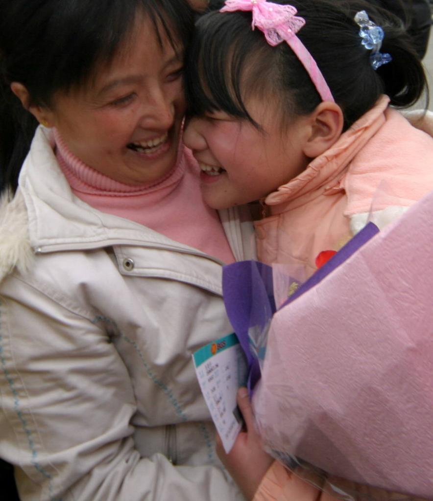 2008年1月24日,一对重庆籍母女在泉州晋江机场见面后相拥在一起。18名重庆籍在福建泉州务工人员的家属乘飞机抵达泉州与亲人团聚,在“第二故乡”欢度春节。新华社发