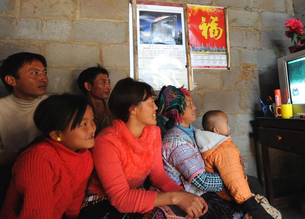 2012年1月31日,回家过年的陶正明(后排左一)、杨国玉(前排左二)与家人一起收看电视节目。在安徽打工的陶正明、杨国玉夫妇回到云南省开远市乐百道办事处核桃寨村的家中,与跟随爷爷奶奶留守的独生女儿团聚,让这个苗族农家小院洋溢着浓浓的亲情和节日的欢乐。新华社记者 陈海宁 摄