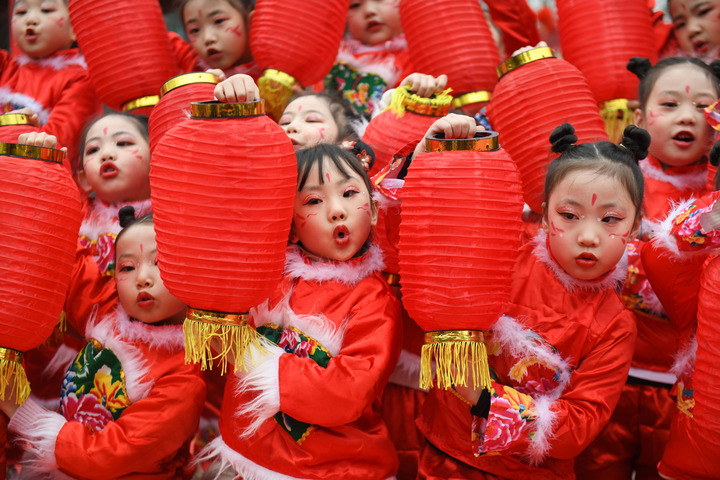 1月18日,四川省阆中市阆中古城,民间艺人和文艺工作者在表演节目欢度腊八节,喜迎农历新年。这是参演的小朋友在表演。新华社发(王玉贵 摄)