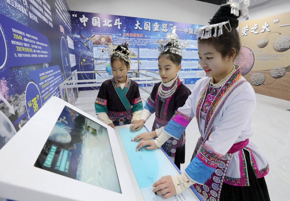 身着侗族服饰的学生在三江侗族自治县科技馆体验科技项目。(三江县民族实验学校供图)