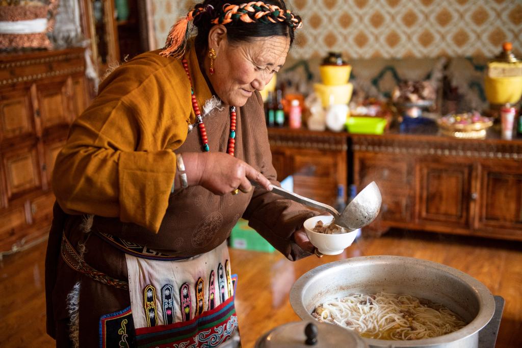 大年初一,斯曲旺姆的儿女们带着各自的小家庭来团聚,百余人的大家庭有几十人回来过年。坐在温暖的家中,斯曲旺姆的孩子们依次献上哈达、敬上青稞酒,被围坐在中间的她希望“这样的日子能久一点,再久一点……”