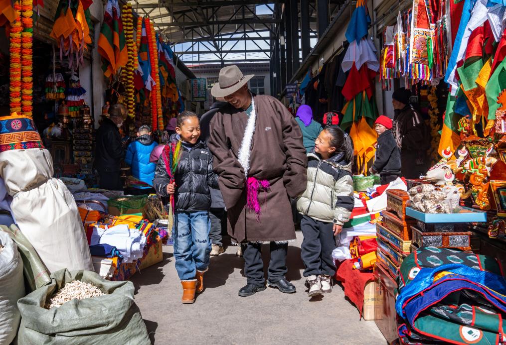 索朗罗达和孙女们在当雄县的年货市场买年货(2月3日摄)。