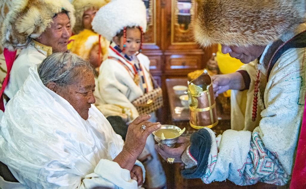 2月10日,斯曲旺姆的儿子索朗罗达(右)为母亲敬上青稞酒。