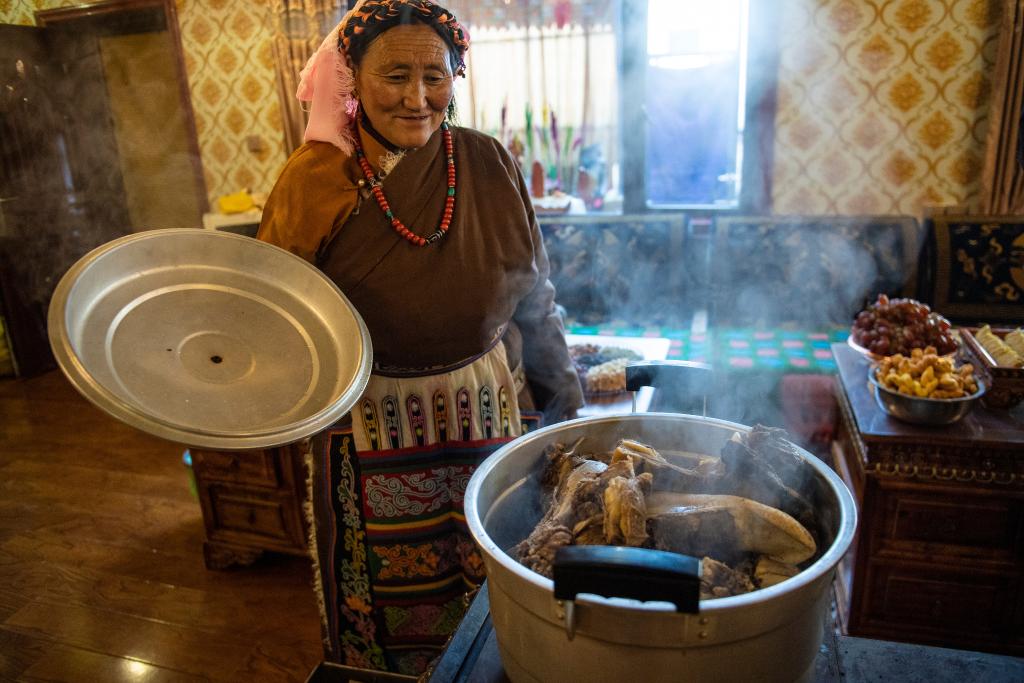 2月10日,斯曲旺姆的儿媳妇朗果在为家人煮牦牛肉。