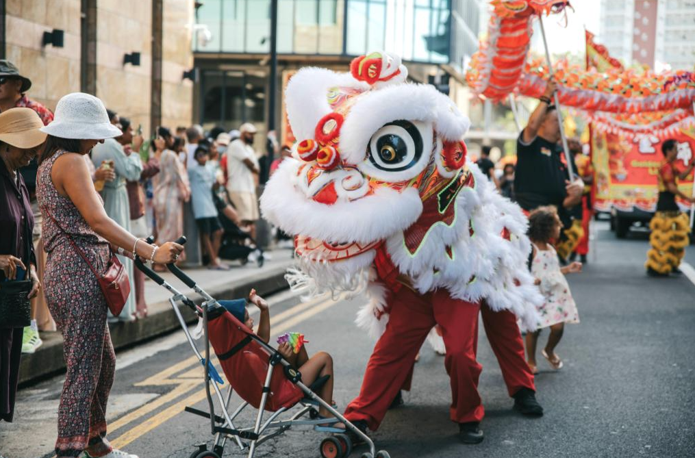 2024年2月3日,在毛里求斯首都路易港,参加2024“欢乐春节”花车巡游活动的演员与现场观众互动。(新华社发 中国驻毛里求斯大使馆供图)