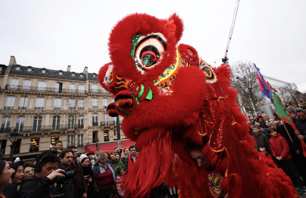 2024年2月4日,人们在法国巴黎香榭丽舍大街观看舞龙舞狮表演。(新华社记者 高静 摄)