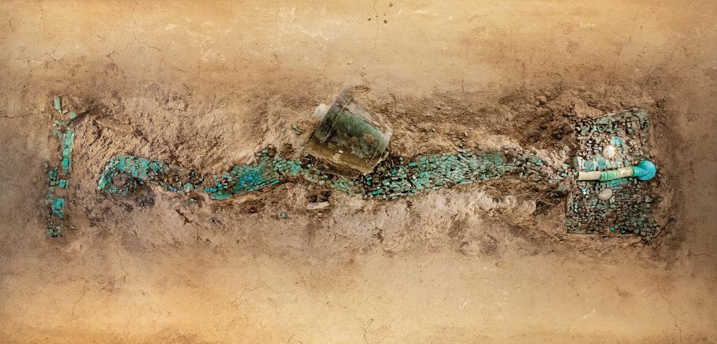 为更好保护文物,博物馆里我们只能看到绿松石龙形器的上半部分,下半部分仍埋在土里,保持着三千多年来的状态,“考古味儿”十足。