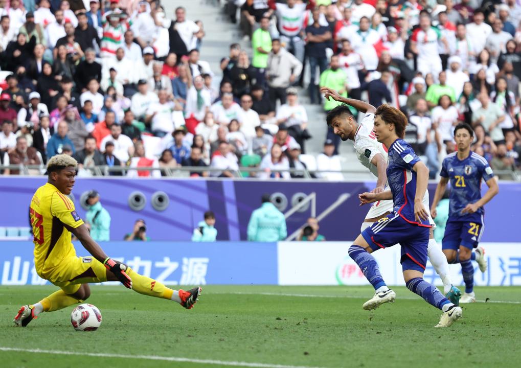 2月3日,伊朗队球员莫赫比(右三)在对阵日本队的四分之一决赛中射门得分。新华社记者 贾浩成 摄