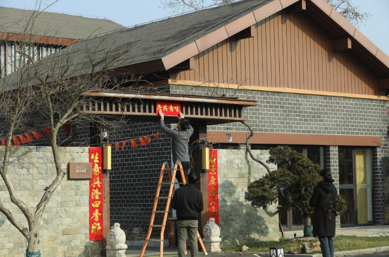 2月9日农历大年三十清早,水墨年华温泉民宿主理人徐胜杰就忙碌起来——树木枝头挂起红灯笼,院门、矮墙、落地窗贴上春联、福字和窗花,红色飘带装点前台兼餐厅……小小的民宿一下子显得年味十足。
