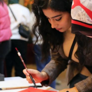 1月25日,埃及女孩在开罗中国文化中心学习写福字。当日,开罗中国文化中心举办2024中国春节文化体验活动,迎接即将到来的中国农历龙年春节。(新华社记者王东震摄)
