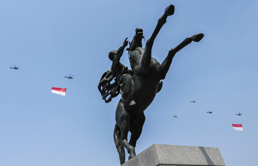2023年8月17日,悬挂印度尼西亚国旗的飞机编队飞过首都雅加达的独立广场上空。新华社发(祖卡南 摄)