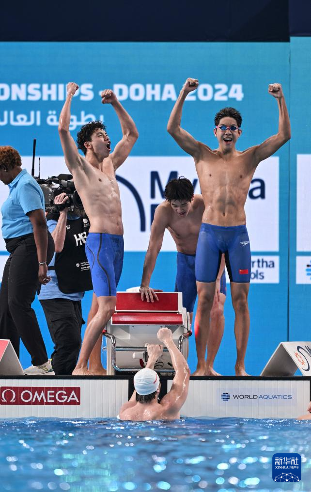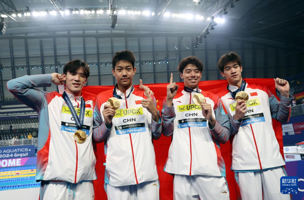 新华社多哈2月11日电(记者刘旸、周欣、孙哲)在11日进行的2024多哈游泳世锦赛男子4×100米自由泳接力决赛中,中国队力压意大利队和美国队摘金,潘展乐第一棒成绩打破男子100米自由泳世界纪录。