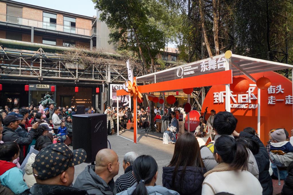 大年初二,位于成都市成华区的东郊记忆园区张灯结彩、人头攒动、热闹非凡。在园区西大门和东舞台等点位,街头艺人和专业乐团在春节期间不间断地为市民游客带来民乐演奏,开启“东郊春季国潮音乐季”。