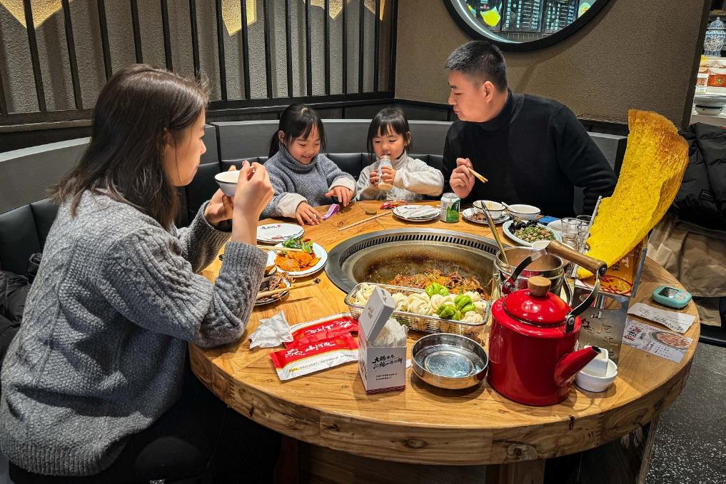2月7日,从杭州来沈阳旅游的王先生一家在沈阳市浑南区的山河屯铁锅炖饭店内品尝铁锅炖大鹅。 新华社记者 潘昱龙 摄