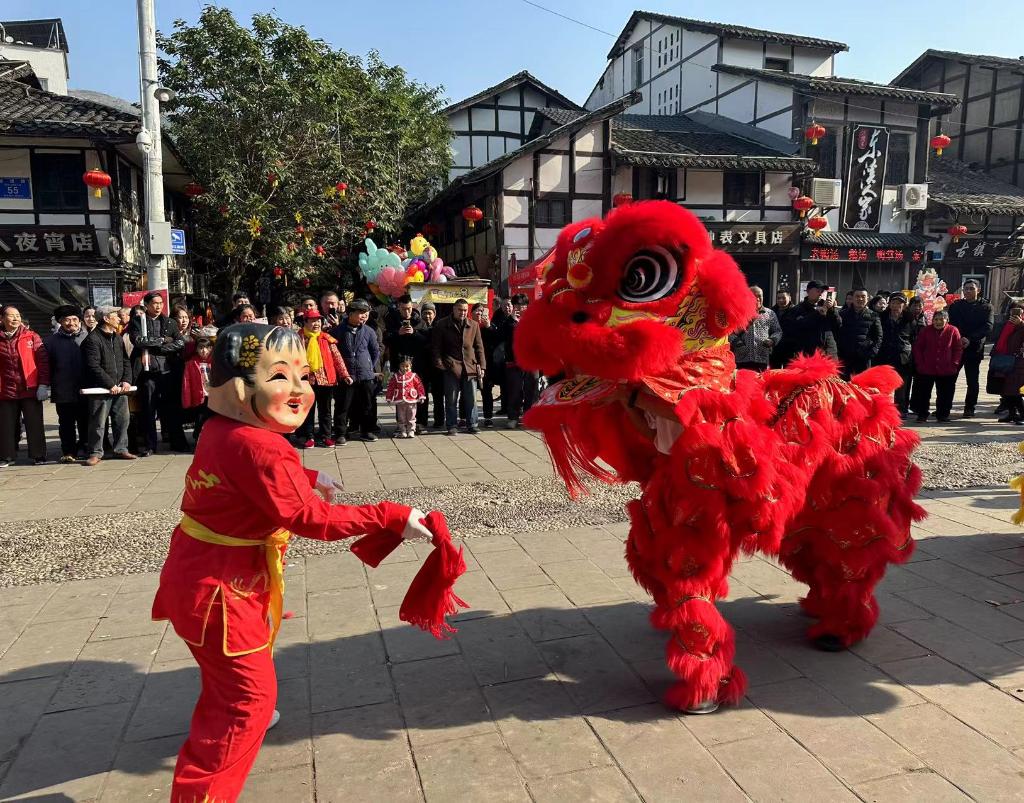 他所在的东溪镇位于重庆市綦江区,是一座千年古镇,人文历史厚重,镇内有十几项省级非物质文化遗产。春节期间,东溪依托镇上丰富的非遗资源,面向老年大学学员、大学生等群体,招募义务演职人员,每天都推出舞狮、舞龙、腰鼓、川剧等特色非遗表演。