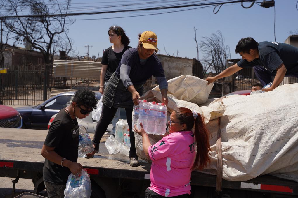 2月8日,人们在智利比尼亚德尔马市火灾受灾地区分发饮用水。(新华社记者朱雨博摄)