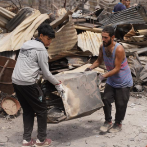 2月8日,人们在智利比尼亚德尔马市火灾受灾地区合力清理废墟。(新华社记者朱雨博摄)