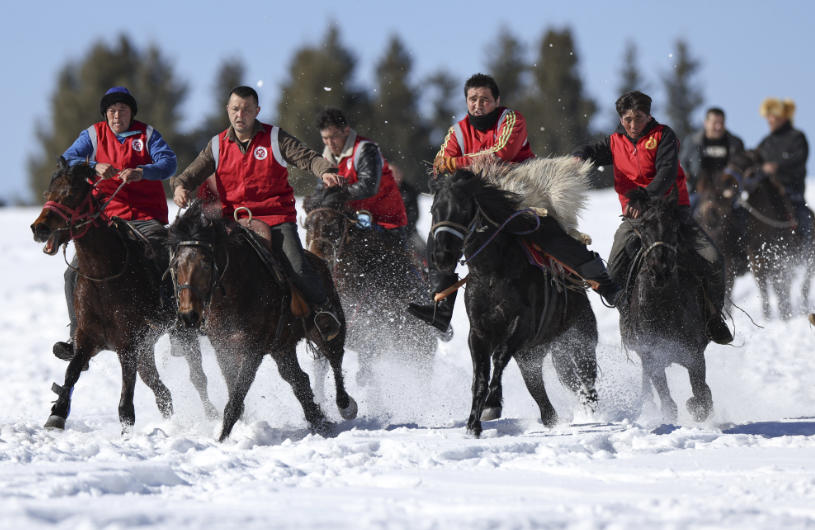 雪原上,各村庄代表队激战正酣。他们时而挤成一团,角力僵持,有时又四散开来,飞驰争抢。每当有勇者冲出重围,把羊扔进用作示意有效得分范围的轮胎内,场边男女老少就会不约而同欢呼赞叹,现场氛围达到顶点。