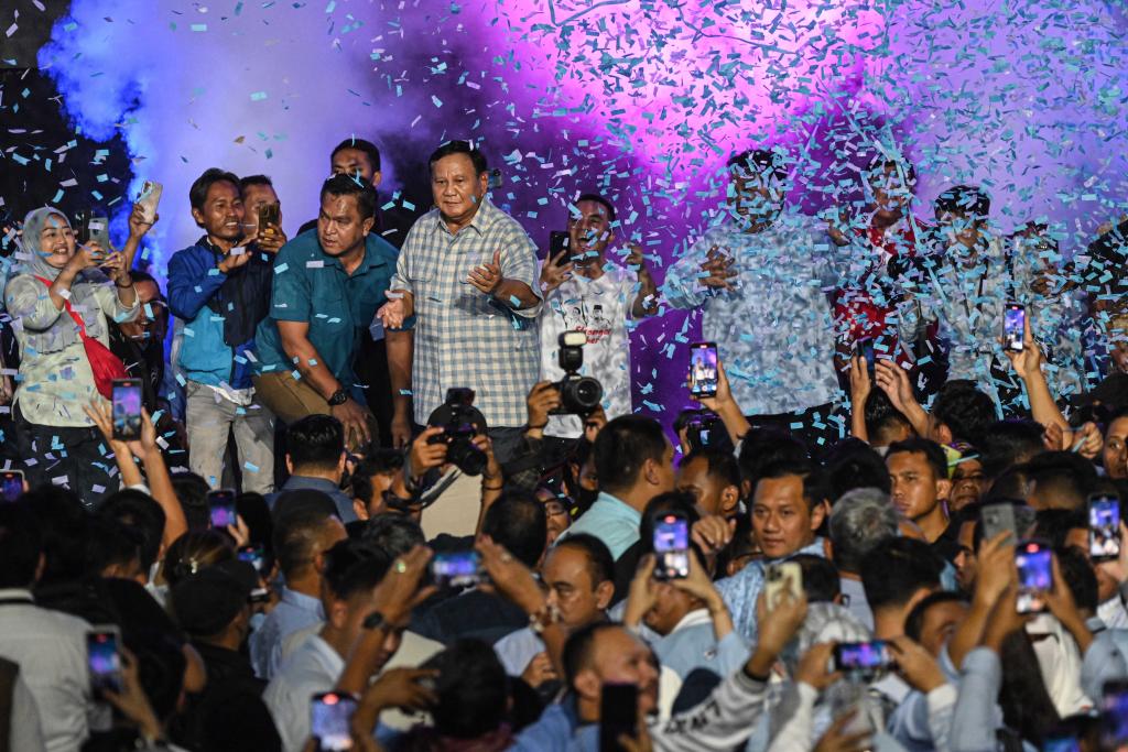 2月14日,在印度尼西亚雅加达,现任国防部长普拉博沃·苏比安托(中)在集会上庆祝获胜。新华社发(阿贡摄)