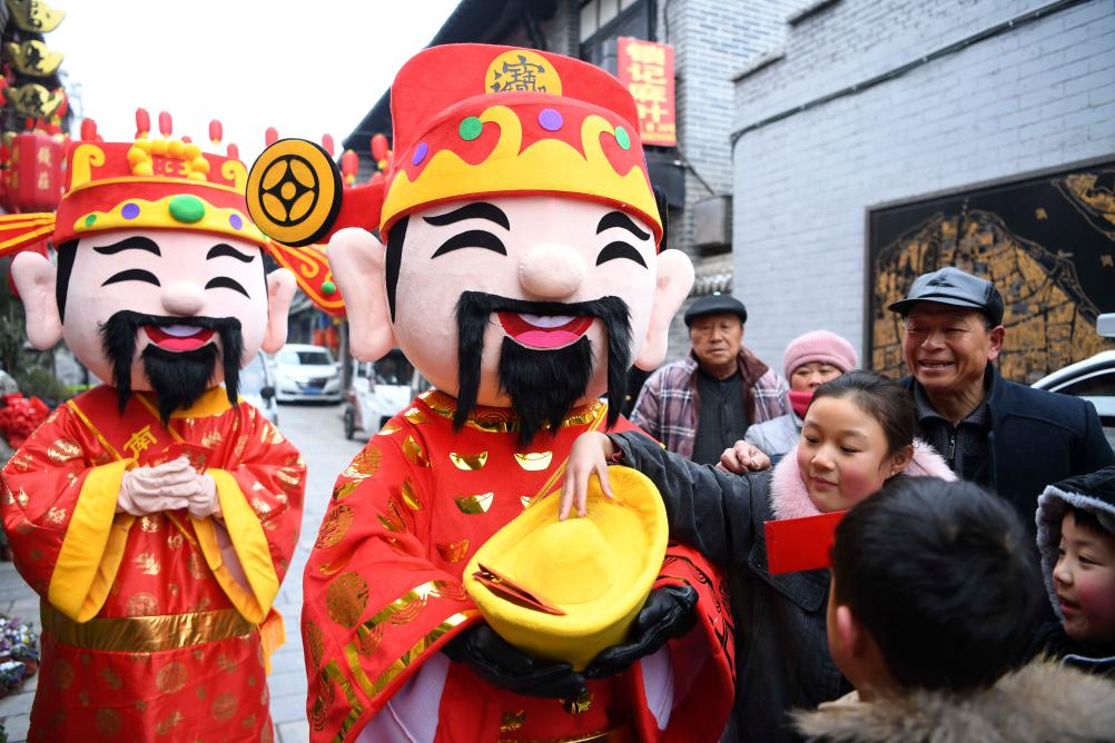 2019年2月9日是农历正月初五,在安徽省亳州南京巷钱庄景区,“财神”向游客发红包、送祝福。