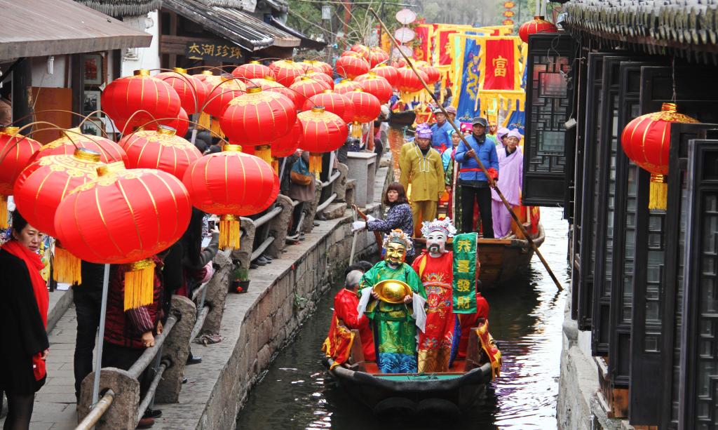 2015年2月23日是农历正月初五,“财神”在苏州水乡周庄古镇乘船巡游,为中外游客送福。