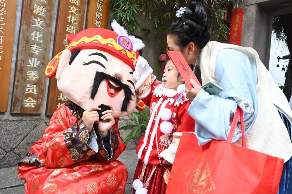 2023年1月26日是农历正月初五,在福建福州市三坊七巷,民俗巡游队伍中的“财神”和小朋友互动。